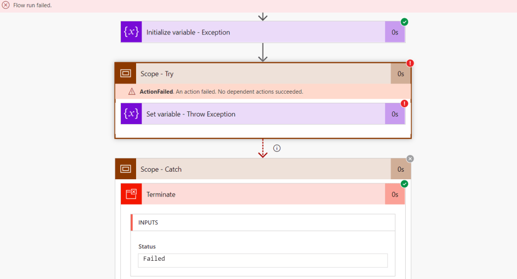 Since our Catch block will run if Try fails, our run will show as Successful. We can change this by adding a ‘Terminate’ action