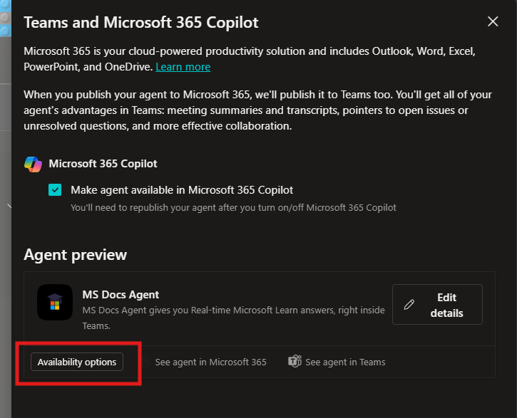- A sidebar opens > Check the Make agent available in Microsoft 365 Copilot > Click Add channel.