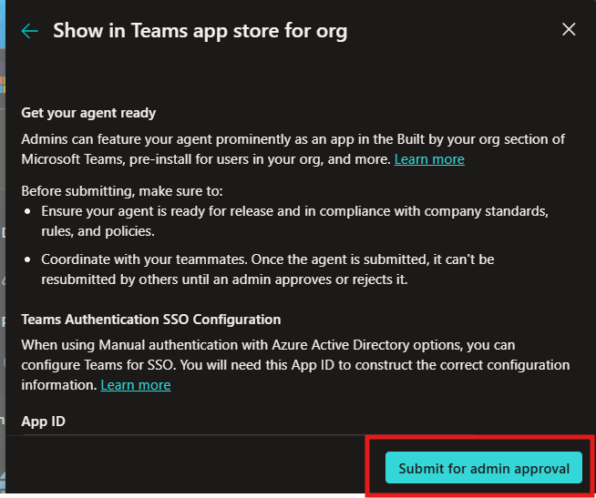 Now because we want our organization to easily find and use this agent. We will submit the agent to the Agent Store. To do this follow these steps: