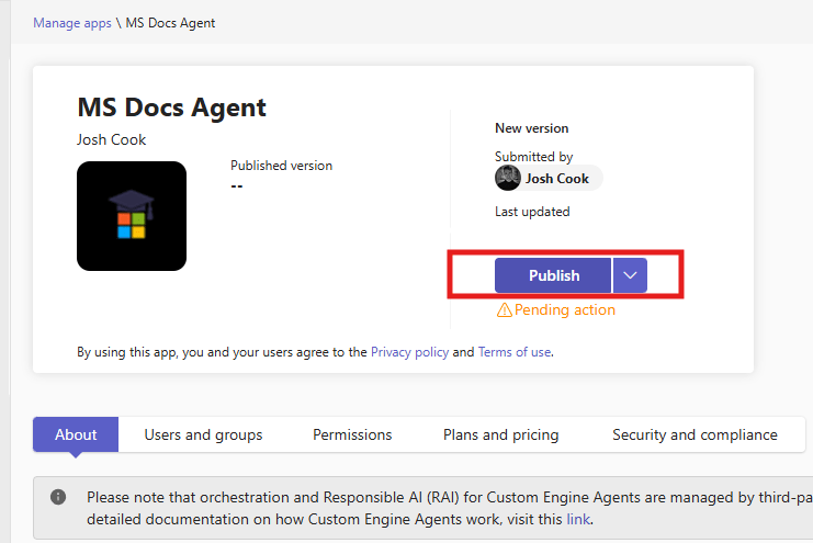- First Publish your agent, to make sure you have the newest version you are pushing to Teams admin for approval.