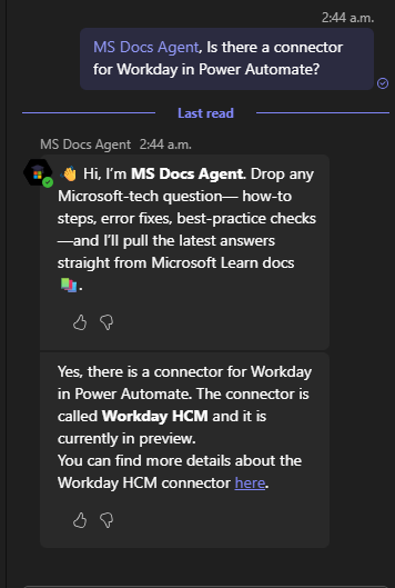 - Description: MS Docs Agent is your on-demand mentor for Microsoft technologies—built with Copilot Studio and powered by the Microsoft Learn MCP server. Every answer comes from the live, authoritative docs that Microsoft publishes each day, so you never rely on stale model memories or web-scraped content.