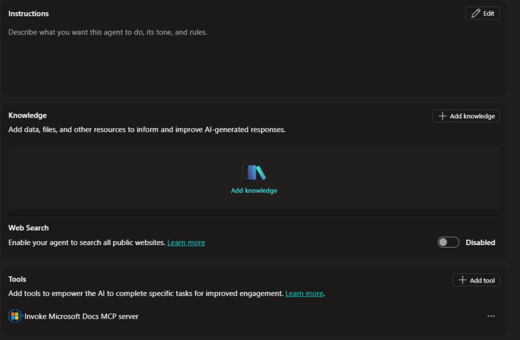 - Web Search – This should be Disabled. We only want the agent to query the docs which it does through the MCP server.