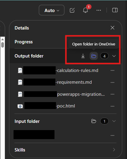 In Copilot Cowork, open the details pane and look for the Output folder.