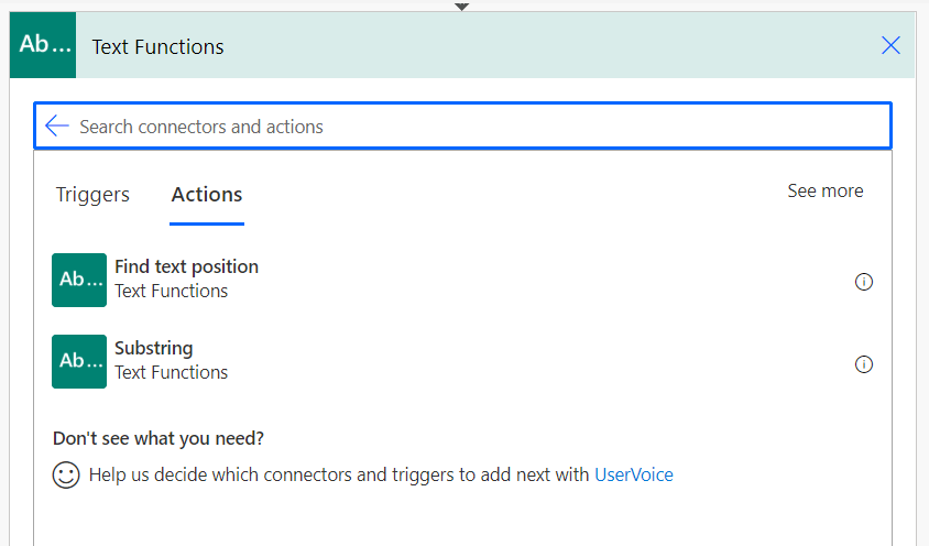 We will be using Substring to achieve this. However we wont be using the expression Substring, we will be using a Action called Substring, this action can be found in the ‘Text Functions‘ connector.
