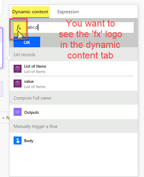 Type anything, this is to keep us in Expression mode when we switch back to Dynamic Content tab