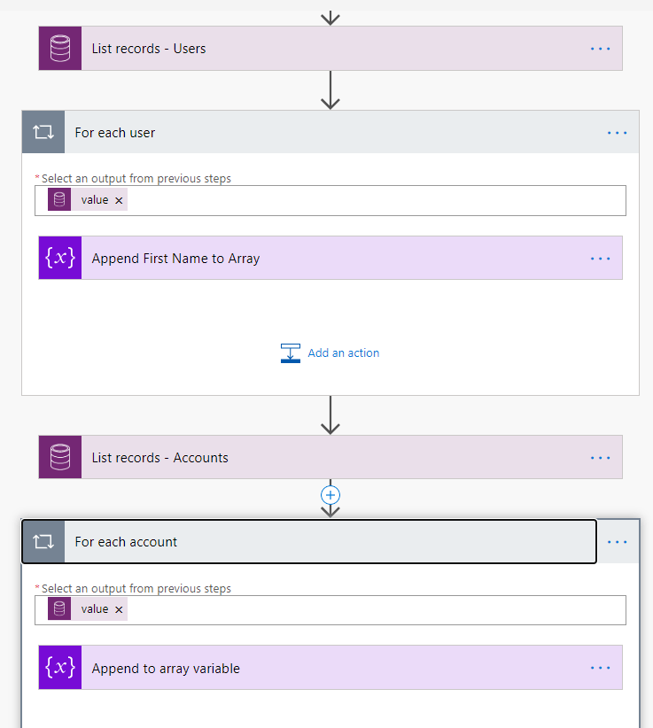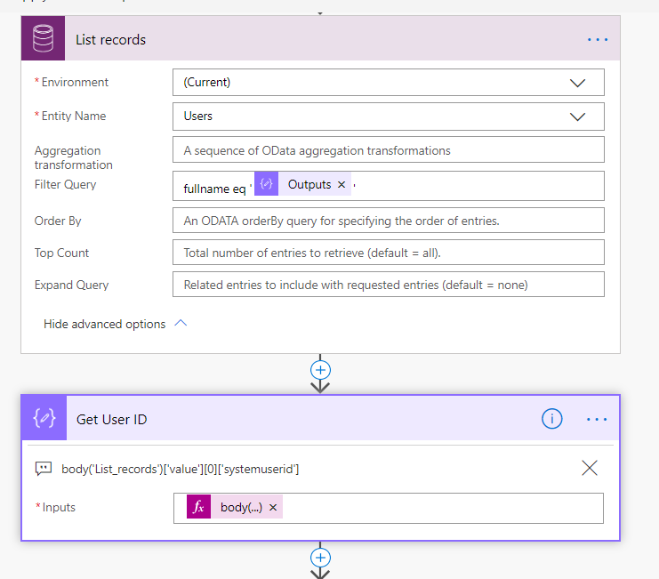 Inside the Apply to each loop, add a List records action on the Users entity Filter Query = internalemailaddress eq ‘ ‘ Add your dynamic content that has the email address for the user to add inside the ‘ ‘