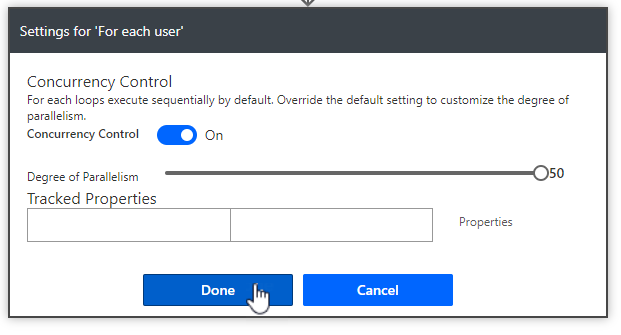 Now inside Settings, find and enable Concurrency Control, and set Degree of Parallelism to 1. This setting is how many runs can run in at one time. Click Done
