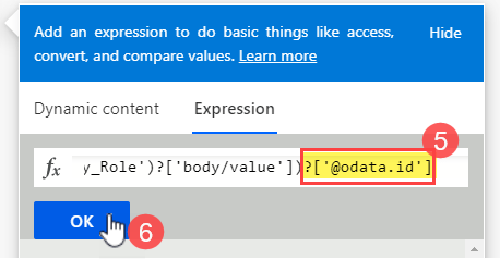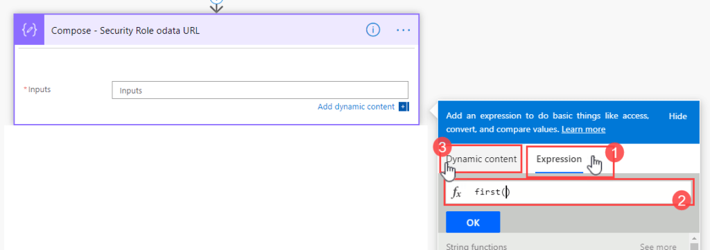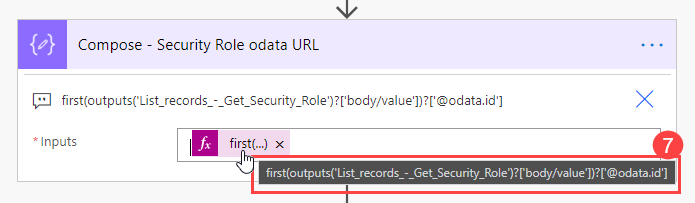 Next, add a Compose action, to get the Odata URL. This URL is how we will add the Security Role to the User later on.