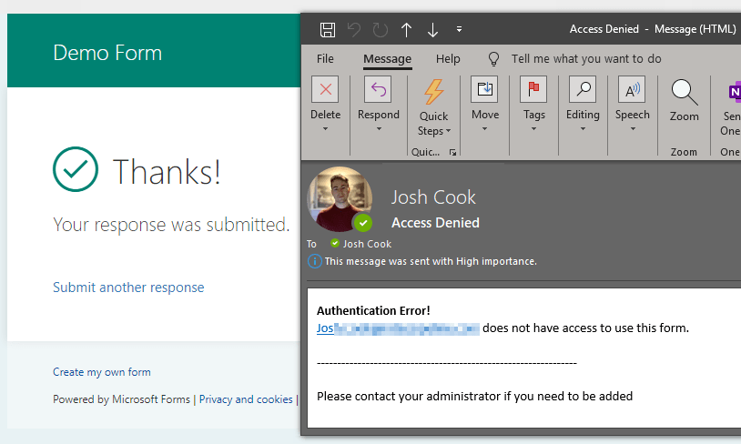 If the user who is filling out the form does not belong to the ‘Authenticated’ list, we Send an Email letting the user know they are unauthorized to fill out this form. Under the Send an email action, add a Terminate action with Status of Success, this is to ensure the flow stops running, while not throwing an unwanted Failed run