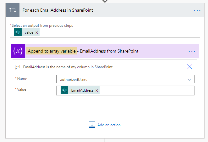 Next, add an Apply to each loop. Select the value from the Get items action. Inside the loop, add a Append to array variable, select the variable that we initialized above. Value = the column name that stores the email Address in our SharePoint List
