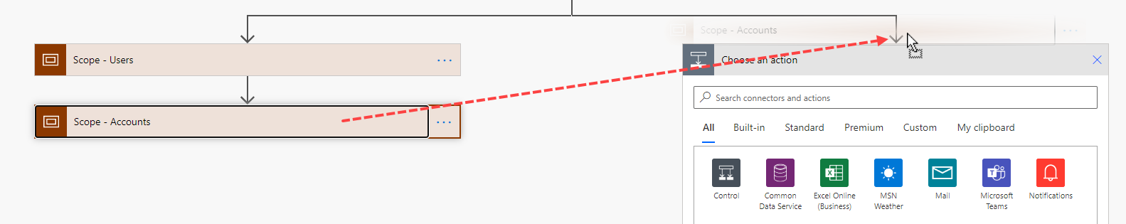 We will use a Try – Catch method. Basically we will use ‘Scope’ actions to house different parts of our actions. You can think of ‘Scopes’ like a way to organize your Flow. Add them into your Flow just like any other Action.