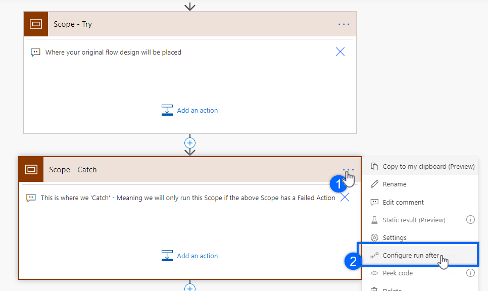 Next we want to only run the Catch Scope, if the Try scope has failed. To do this, simply click the Three(3) dots on the Action and click ‘Configure run after’