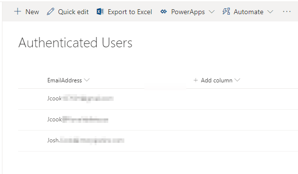 Next, we setup our List of ‘Authenticated’ Emails. Again in this demo I am using SharePoint I created a simple SharePoint List with a single text field to store email addresses