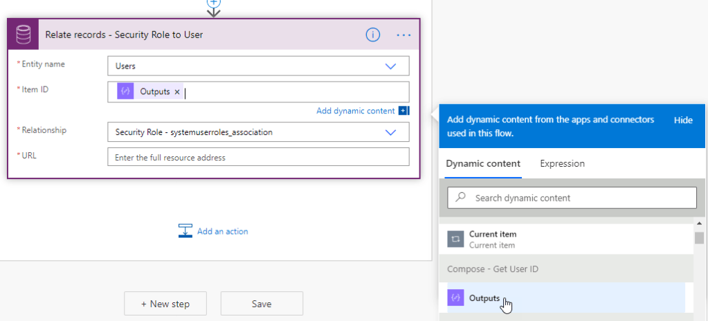 Still inside the Loop: Add a Relate Records action.. This is one of the actions inside the Common Data Service Current Environment Connector. Entity Name: Users Item ID: The Compose – Get User ID Outputs Relationship: Select ‘Security Role – systemuserroles_association’ from the drop-down URL: The Compose – Security Role odata URL