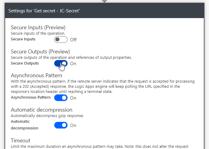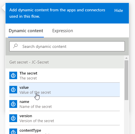 First we want to search for ‘Azure Key Vault‘ when adding a new action in our Flow. We will use the ‘Get Secret‘ action