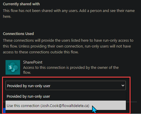 Under Connections Used, switch ‘Provided by run-only user’ to the connection you want to be used by users of the App (They wont have access to this Connection outside this Flow)