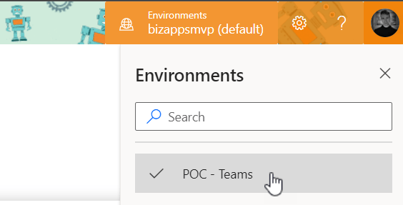 Sign in, and select the environments menu in the top right and choose the Environment that correlates to your Teams name where you built the Bot.