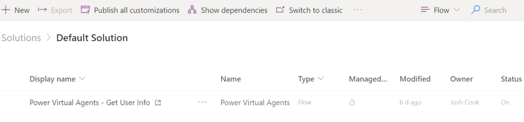 All Flows built inside the Teams environment for PVA chatbots are stored in the Teams environment under the Default Solution.